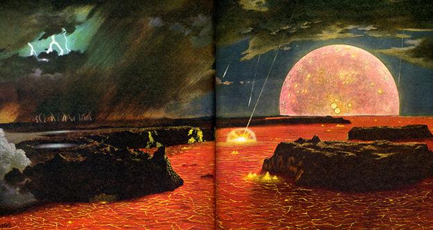 "Rivers of molten stone flow across the earth as lava erupts to the surface through weak points in the cooling crust," in The World We Live In Volume 1: The First Four Billion Years (New York: Time-Life, 1963).
