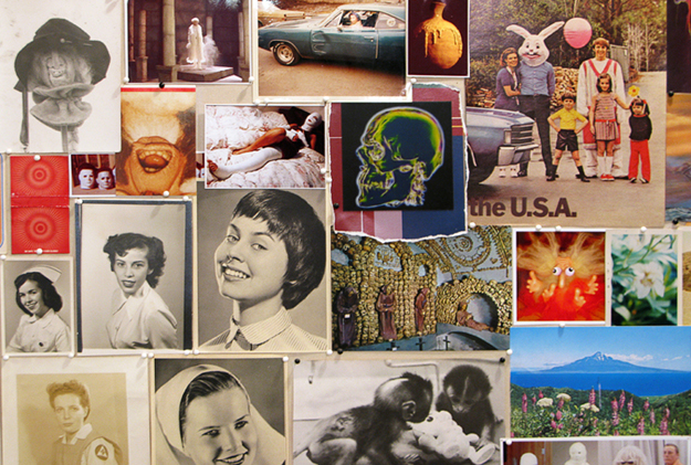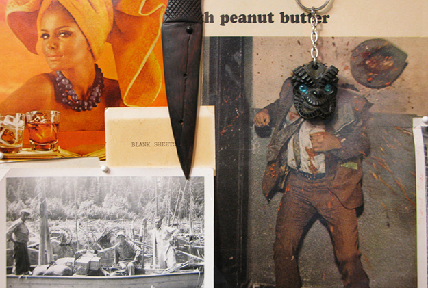 The element of looking is essential to my studio practice and has its roots in the scavenging or salvaging that I’ve always done in my work with books and ephemera. My project is centered on the collection and research of visual materials, and it evolves through a methodology that often uses collage as both investigation and final work. My home studio houses my collections of books and objects, and through them I construct a world, an alternate universe. This accumulation provides the space I most want to inhabit. It’s a collection of old and new things: books, artwork, trolls, color wheels, photo collections, paper and ephemera, latex monster masks and props, ceramic mushrooms, holograms, underground comix, images of cavemen, and old wood paneling, among other things. Outside, succulents grow from cuttings and abandoned plants. It is a collection of things that are dead and alive. Collecting these objects saves them and gives them life. Some of them are reconfigured into new things and new pieces. Others just lay there, waiting.