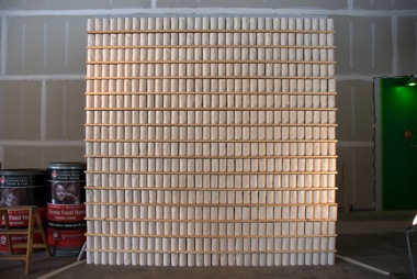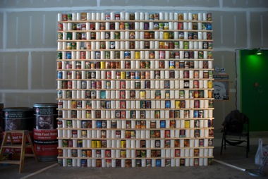 Jay Dion. Untitled (Cans), 2009; ceramics, wood, canned goods; 8 x 8 ft. Courtesy of the Artist.