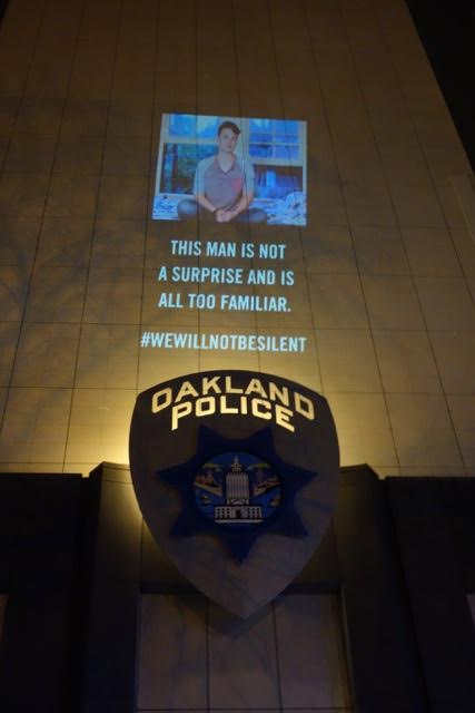 Projection on exterior of Oakland Police Department headquarters, fall 2016. Courtesy of DISCLOSE.