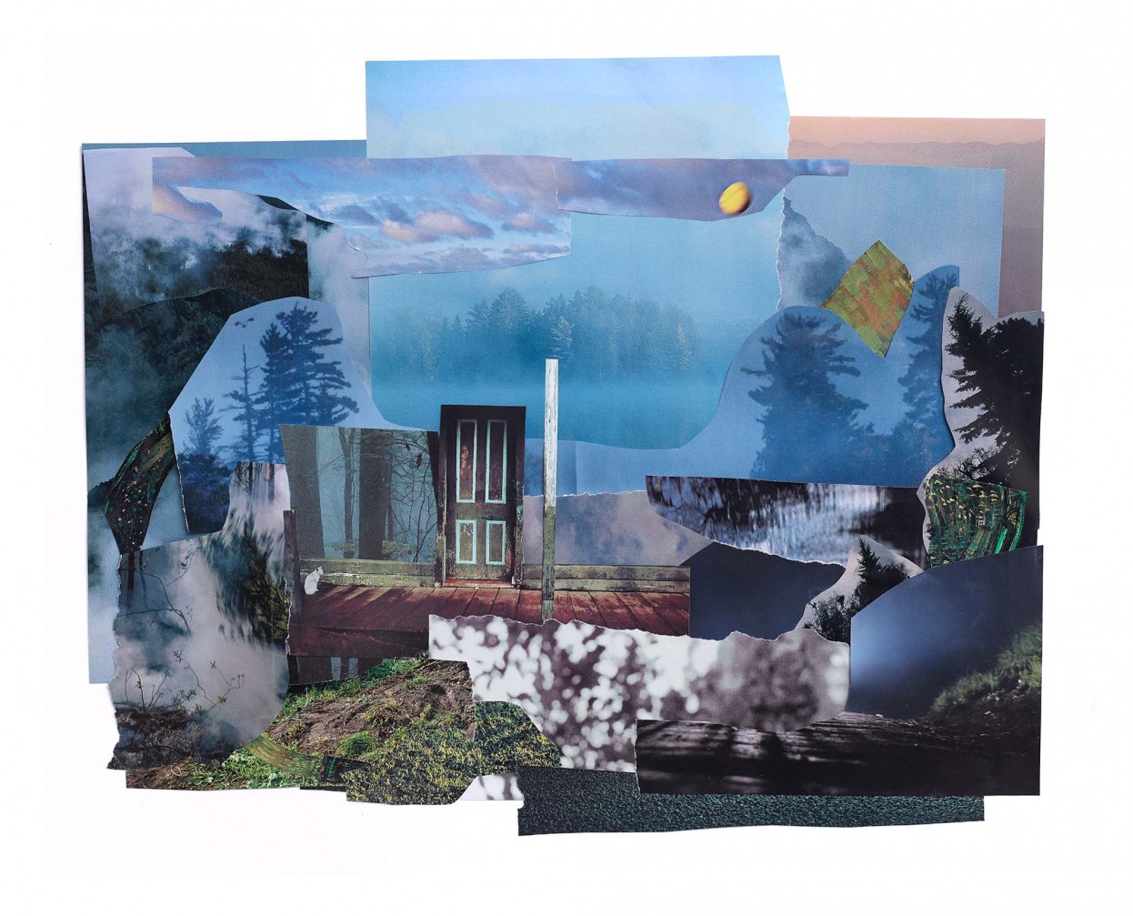 Something need not be stable, but still, it should enact though, seeing through the eyehole when it is rotated—to grind out not the seeing, but the sense of the shadow as blur, that leads not to the door, but more blur —so we too, are waiting, to not pounce, but to bound, or rest, rested, gray, was there, the blues, and the lake, and the thick wood, white board in the collage’s center that is the Y in the X: