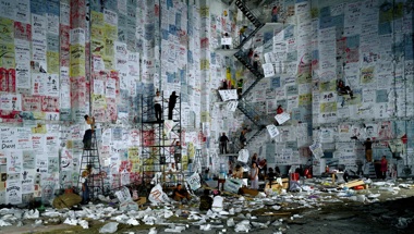 It was on my second viewing of Wang Qingsong’s comparatively bold photographic diptych, Competition (2004) and Debacle (2009), hung at the far end of the entrance hall, that I began to appreciate his ability to highlight the reverberating impact of the global economy in China, its sweeping successes and failures. He juxtaposed two large-scale photographs of the same towering urban walls at different moments in time: formerly plastered in a bright patchwork of advertisements during an economic boom, now abandoned and faded during the current economic recession.
