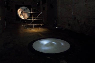 Equally intriguing was the video installation Umbra: Penumbra: Antumbra (2010), by the Australian artist Brodie Ellis. I reluctantly stepped through a large rain puddle at the entrance into the ominous, pitch-black space of the installation, and was pleasantly surprised when my eyes adjusted to the encompassing darkness. For Ellis, light and sculpture are significant accoutrements to her video work. For this installation, she elongated the exhibition chamber by placing two elliptical frames on the floor in the foreground and middle ground, and placing a third frame on the wall in the background. She created the first and last frames using the light of video projections, while she fabricated the middle frame by welding thick steel rods to create a heavy conical sculpture that anchored the optical experience. Resting on its side and illuminated by an overhead spotlight, Ellis’s sculpture mimicked the anatomy of an eye, referencing the mechanics of vision and depth of perception.