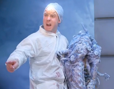 Afterward, surrounded by burrito wrappers, an aggressive military doctor, played by same actor who depicts Sam, questions a poisoned Eric. The diagnosis? Eric is pregnant! Later aboard a submerged submarine, the same spectral doctor attends to Eric in the process of birthing; his third eye glows as the creature emerges from Eric’s “manhole.” As the slacker pair adoringly speculates about which Ivy League college their new son should one day attend, the newly christened Craig is declared by the spectral medical army general a “level-six-illegal-extraterrestrial.” Sam and Eric plead with the General to let their eleven-eyed purple Craig go free, and two figures in Immigration and Naturalization Service (INS) uniforms cover the pair’s heads with black bags. The next thing you know, the two, tossed out from the submarine and dragged onto land, are shoved through a crowd of longhaired ragamuffin protestors, thrown into the back of the INS’s deportation van and driven away.
