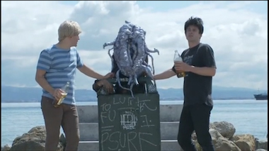 Distilled, Mindglow is the story of two slackers, brunette Sam and blond Eric, who birth an extraterrestrial named Craig after eating contaminated burritos. In the quirky plotline set in the near-distant future of San Francisco in 2012, Mindglow opens as the pair frantically brushes their teeth together in the bathroom mirror. Later, as the two idly bicker about whose turn it is to buy lunch, a horrifyingly abject subterranean troll messes around in a shit-filled toilet, making faces in the mirror and incanting in his underground hideout. Leaving their fate up to a slug at hand, the answer is decided: Sam and Eric summon the troll up from the subterranean depth, and he takes their order from inside of the trashcan at the top of his subterranean lair. It’s really gross in a playful way: the abject creature makes Eric’s burritos from an overflowing toilet and then injects each one with a mysterious fluorescent fluid.