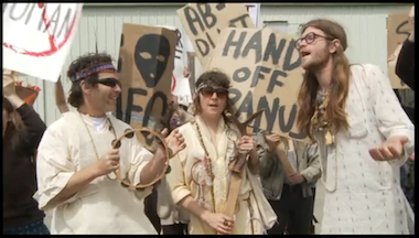 Obverse of the invocation of this particular archetype in Mindglow is a parallel deployment of the dashiki-clad long-haired hippie protestor. Synonymous with how we envision a collective will to change, they march against the INS bearing signs that read “Legalize Things” and “I’m up-S.E.T.I.” They embody revolutionary posturing: “a protest for the fucking sake of protest,” as Svedas sees it.6 The exploitation of pre-formulated characters that lead a viewer to a set of expectations points to the obvious: films are produced to fulfill expectations of genre, and audience expectation determines the types of films that are made. In this chicken-egg-thing, in this anti-thought tomb, nothing new can ever really happen.