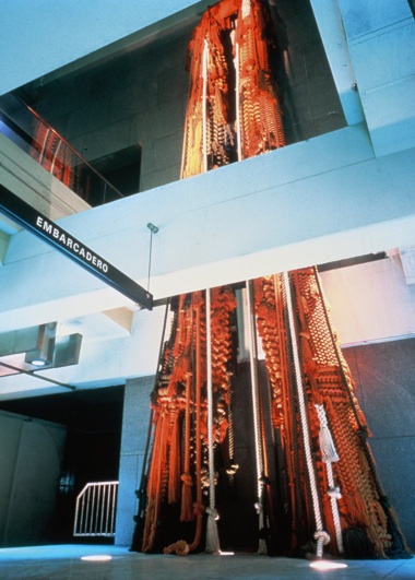 The object is 50 feet tall, 20 feet wide, 6 feet in diameter and clearly weighs several thousand pounds. It hangs in an open three-story nook in the Embarcadero BART/Muni station in downtown San Francisco. The first time I noticed it, I was fascinated—this thing was so dirty and dusty that the layered history of its filthiness somehow made it romantic and intriguing. As if it could be a sculpture. Initially, it seemed impossible that an actual artwork could be so publicly neglected, so I assumed I was looking at some kind of functional object. Largely composed of masses of rope in knotted configurations that appear vaguely purposeful and bearing a significant accumulation of grime, I thought it was perhaps used to clean the trains, like a big car wash.