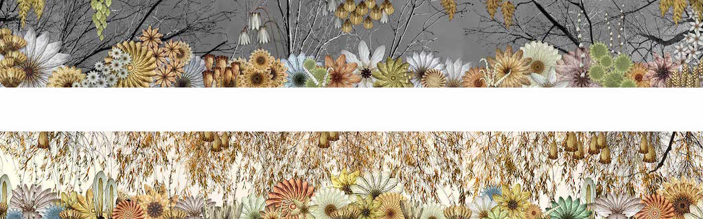 DeWitt Cheng: Hexapodarium designates a collection of six-footed creatures (or plants), and most of your prints depict one bloom, centered on a white ground, like a scientific specimen. Two panoramic pieces, Winter and Fall, however, are landscape panoramas akin to the paintings of prehistoric life we’ve all seen in museums. Rudolph Zallinger’s classic 1947 depiction, The Age of Reptiles [at Yale University’s Peabody Museum of Natural History], comes to mind. Of course the stylization of the blooms, with each presented facing the viewer, has a visionary, otherworldly feel, too: This is thus a museum display of a new life form, 240 million years hence. Any thoughts on how humans will look by then, if we’re still around?