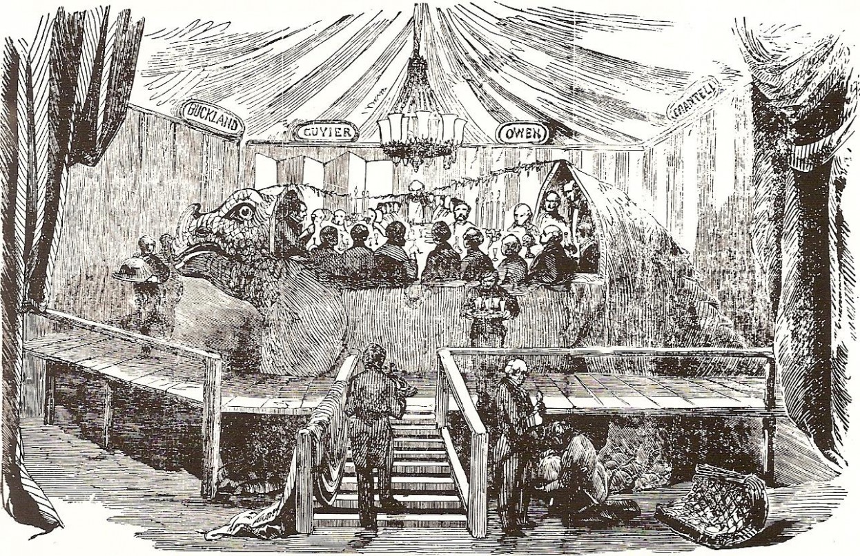 There’s a wonderful engraving from 1853, of a New Year’s Eve banquet attended by some of the most prominent evolutionary theorists of the day. It took place in the vast studio of Benjamin Waterhouse Hawkins, who was sculpting the giant bronze lizards that would inhabit London’s Dinosaur Court. Hawkins was midway through constructing a massive iguanodon, and the dinner was held in the beast’s open belly. The iguanodon was large enough to hold more than a dozen men, an attendant wait staff, and a sumptuous table.