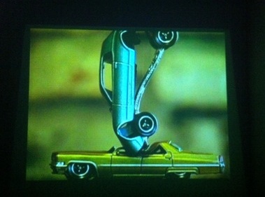 Young’s descriptions are also vivid and poignant. In the same review, he notes, “[A] model car is driven vertically into the roof of another and begins to resemble the sensuously strained contour of a ballerina’s foot en pointe. The ensuing, achingly slow, contorted collapse of one car into the other carries with it a graduating sexual tension as, little by little, the metal bends and snaps, the glass cracks and pops.” I love the image of the ballerina’s foot this conjures, particularly as it successfully marries a clunky, metal car to a nimble, delicate dancer. The tension that the writer perceives in this artwork is transmuted into his language, so that the sentence develops its own crescendo of tension.
