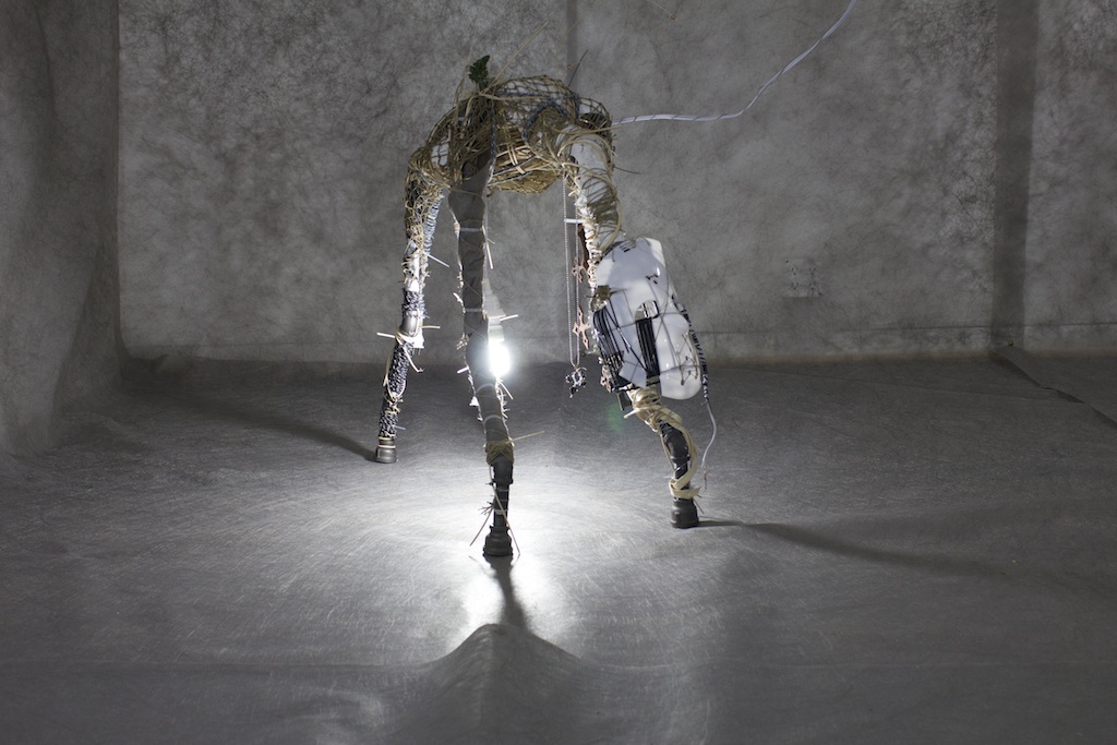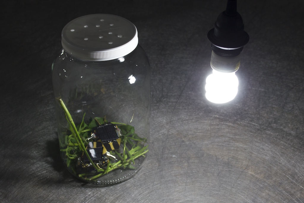 Coke Life cans teeter slowly around the gallery floor, flowers sprouting from their pull-tab mouths. Joel Dean’s Earthlings (2015) pieces operate on oblong wheels with battery-powered robotics desperately trying to move them forward. Playing on our human knack for personifying all things, Dean shrewdly casts these sculptures as cute, almost reminiscent of Wall-E, yet in calling them “earthlings,” there’s something disturbing in these Coke Life cans: a corporate cooption of natural and organic foodstuffs being left behind as humanity passes. There is a moment in Cormac McCarthy’s The Road where the man and his son savor a can of Coca-Cola, an act that is so mundane yet harmful to our health, and in this dystopia provides a kind of normalcy for the father, a reminder of a past life. These gestures of normalcy are present in Dean’s untitled sculpture made of a glass jar containing two tiny machine-looking creatures powered by solar energy and equipped with light-sensing "eyes," as well as sensors to help them avoid obstacles. Displayed as one would a bug in a jar, the robotic beings have leaves to munch on and holes to breathe fresh air from. It’s an eerie proposal: If insects die out, will we treat and care for robots in the same way?