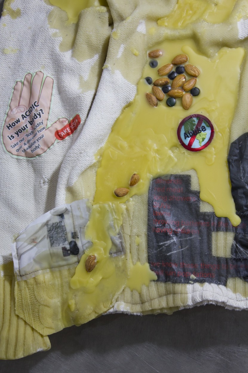 Erin Jane Nelson. How Acidic Is Your Body?, 2015 (detail); cable-knit sweater, inkjet print on cotton, beeswax, spirulina tablets, almonds, embroidered patch; 30" x 23" 3". Courtesy of the Artist and City Limits, Oakland.