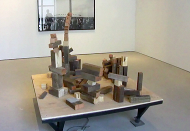 The commercial galleries provide a welcome opportunity for increased familiarity with the local context. The spaces are often dazzlingly large and architecturally imposing, such as Galeria Vermelho’s honeycomb complex or the huge, airy converted warehouse belonging to Galeria Baró. In terms of the exhibitions themselves, Inhotim curator Rodrigo Moura’s First and Last, Notes on the Monument, a group show presented at both sites of the venerable Luisa Strina Gallery (Sao Paulo’s first commercial gallery, begun in 1974 and still going strong) is particularly notable. Addressing the nature of the monument—or rather debasing it—the show is enlivened by irreverently humorous works, such as Pedro Reyes’s Simulador de Temblores (2010). Visitors are invited to assemble the wooden building blocks scattered on a low wooden platform into random mock-monumental forms, then encouraged to touch a foot pedal, unleashing an electric earthquake. The delightful noise and havoc of the blocks crashing down onto the gallery’s floor quite compensates for the initial shock of destruction.