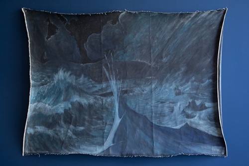 A boggy, soggy, squinchy picture truly, enough to drive a nervous man distracted. Yet was there a sort of indefinite, half-attained, unimaginable sublimity about it that fairly froze you to it, till you involuntarily took an oath with yourself to find out what that marvelous painting meant. - Moby Dick, Chapter 3 At the beginning of Chapter 3 of Moby Dick, Ishmael describes a unstretched painting hanging in the Spouter-Inn --an almost abstract torrent of grey, blue and black-- to be "so thoroughly besmoked", that one might take it to be "some ambitious young artist's...endeavor to delineate chaos bewitched." He learns from others that it may have originally depicted a whale being impaled on the three masts of a ship during a hurricane. All the remaining visual clues are a limp black cloud near the center of the image and three poles. What is amazing is not the precision with which Colter Jacobsen has recreated a painting from Melville's lengthy description, but the way in which he consolidates the complexity of the novel. Foremost, the abstraction of the image speaks to the unruliness of the novel. Further, it attests on its very surface to the passage of time: not only the span within the novel - the period it hung in the Spouter-Inn before Ishmael encountered it, but also the ensuing years since Melville published Moby Dick, which saw the novel itself become clouded by the soot of pop culture and academia. The painting described by Ishmael was aged and obscured by the generations of tobacco smoke rising up alongside the stories, laughter, brawls, and histories of the sailors in port. It is this intergenerational vaporized machismo which shrouds Sp(out)er (In)nomine diaboli. It is a relic of hyper-masculinity, visualizing a bond shared between men. The almost pornographic scene of the impaled whale becomes a sensitive encounter between the viewer and the artwork in Jacobsen's painting. He locates a diffused and intimate, if troubled, space within--and literally on top of--the novel's epic structure, evoking queer desire and depicting the homoeroticism that courses just beneath the book's surface. Unlike much of the other work in this exhibition, Jacobsen's painting isn't clever or cute, but consolidates many of Moby Dick's nuanced concerns. It stands out as an example of what an artist dialoging with a great work of art can do in the present moment; one that doesn't supply cheeky answers in sailor's suits, but offers a challenge, and invites us on its quest for knowing.