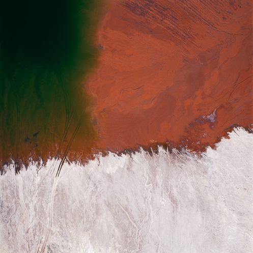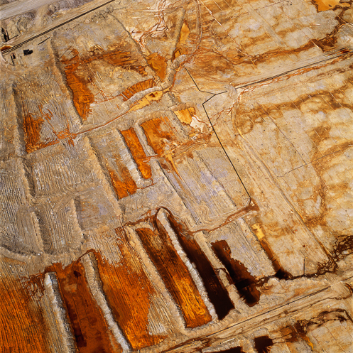 Maisel shoots his photographs from above while he is strapped into a banking plane, resulting in the felicitous effect he describes as “lock[ing] out the sky,” a reference to the Modernist photographer Frederick Sommer, one of his key influences.1 In this position, Maisel says, “shapes and forms don't exist per se. They exist in that moment.” As he shoots, the steep, wide angle of view, the absence of a horizon line, and his shifting position, all rob the space of its identity. Maisel composes the images in a square format, leading to what he calls “compaction,” which, by defying the conventionally horizontal orientation of landscape imagery, heightens the works’ abstract qualities. He does not manipulate color, he says; he manipulates “tonal field.” But the actual colors of mine tailings—lakes of chemicals in water—are otherworldly enough to be confounding.