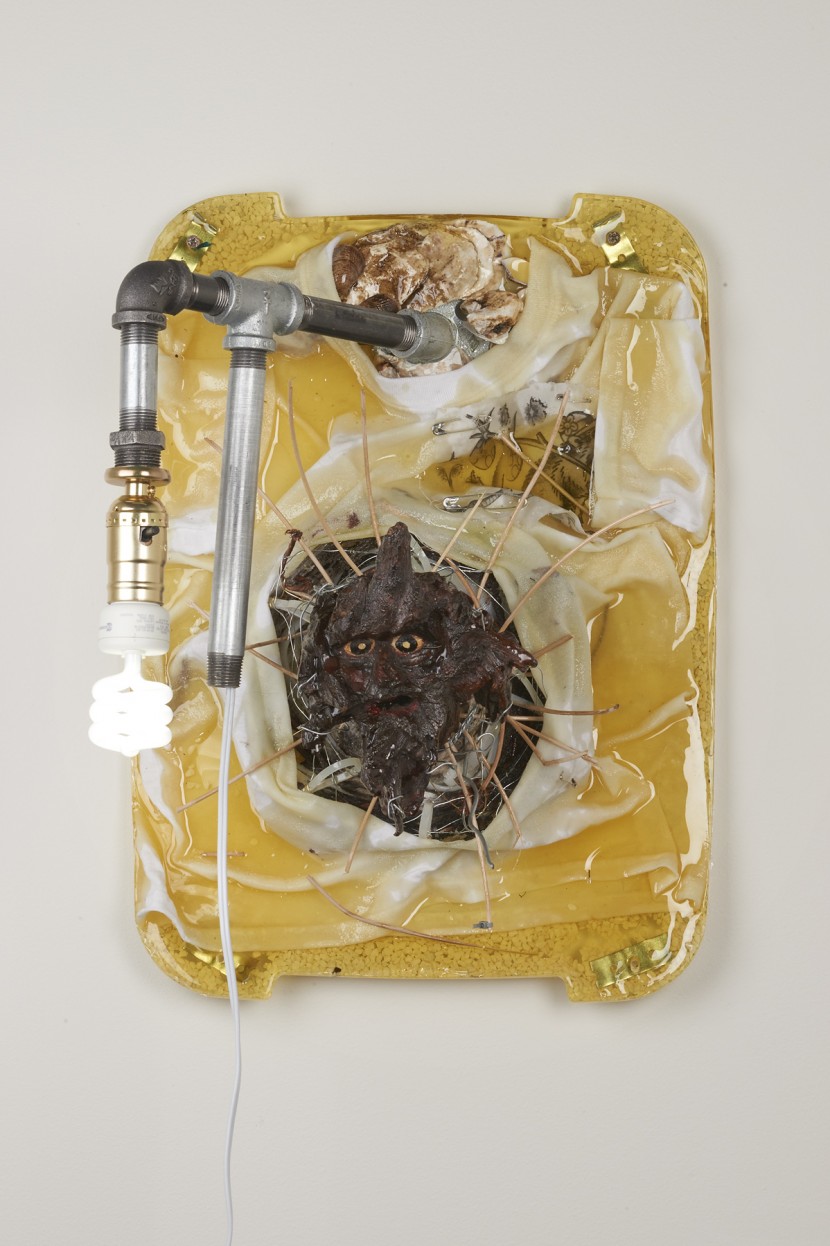 Jason Benson’s sculptures, by comparison, combine hardware with found objects to create three-dimensional portraits of otherworldly creatures. In an untitled 2015 work, a pipe juts out from a rectangular surface coated in epoxy resin. A coiled CFL bulb suspends from one of the pipe’s joints, while a long electrical cord hangs slackly from the other. The bulb glows with an eerily diffuse silver light, lending the amber-colored epoxy resin a warm hue. A disturbing sight, though, offsets this warmth: a child’s white T-shirt, its folds hardened into place, with a carved wooden bust exploding through its chest, encircled in a wicker wreath, its face contorted into twists and knots. Benson’s juxtaposition of folkloric objects and commercial materials presents a surreal tableau out of a modern-day Grimm’s story, a dreamlike fantasy of industry and fairy tales.