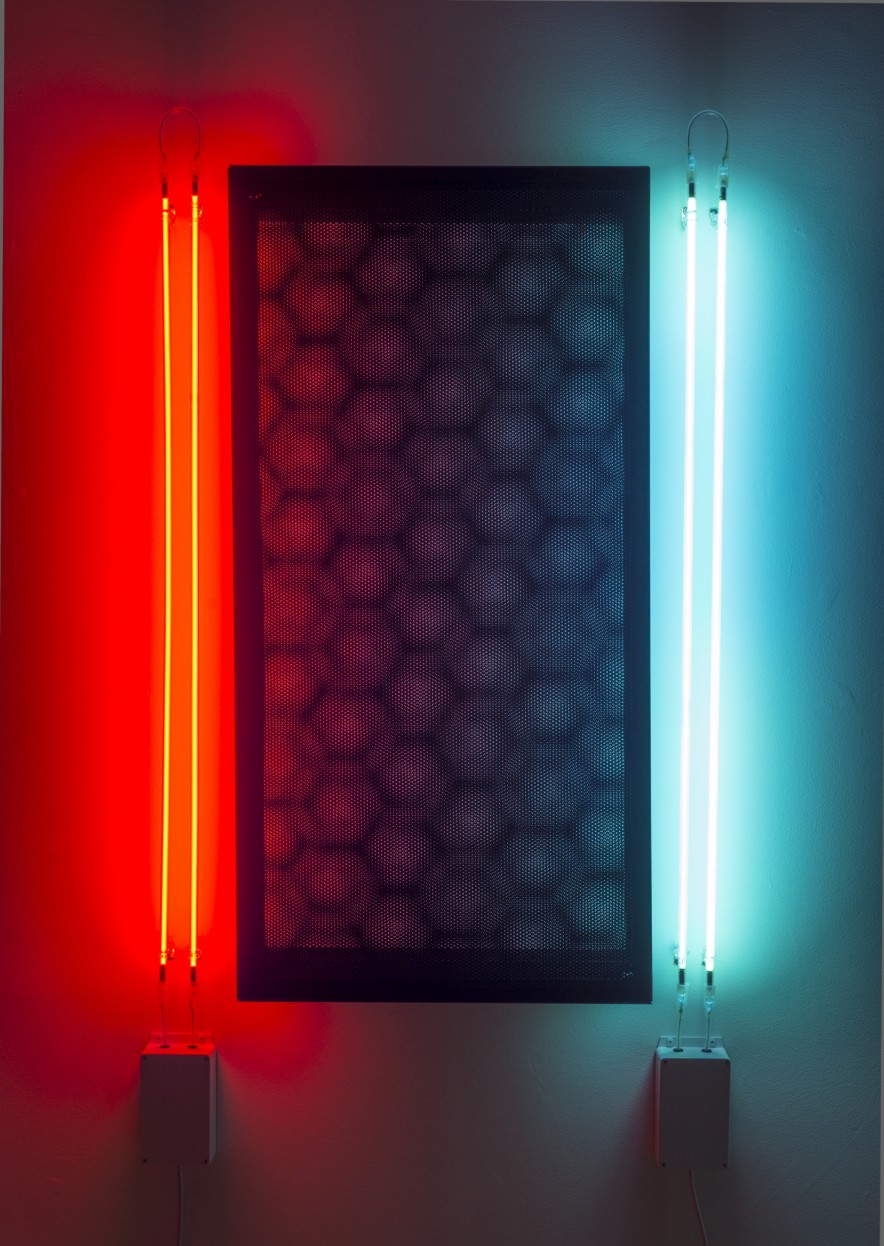Chris Fraser. Mobile | 0˚, 90˚, 90˚ | Argon and Neon, 2015; powder-coated steel, gas discharge tubes, transformer, argon, and neon; 42 x 21 x 12 in. Courtesy of the Artist and Gallery Wendi Norris, San Francisco.