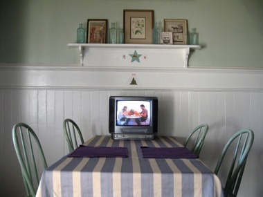 Brion Nuda Rosch and Chris Sollars. TV on Table, 2009; lunch performance with kitty voices, filmed at Arthur's, shown at Allan's; installation view. Courtesy of the Artists and Hallway Projects and 667 Shotwell, San Francisco.