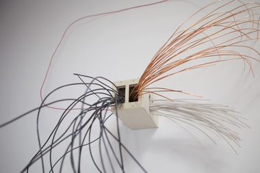 In ReVolt (2010), an outlet plate cover and an electrical box protrude from the wall, anchoring Lewis’ drawing-like installation. On the left side of the outlet plate, black electrical wires splay out and cascade onto the floor into a jumbled pile. While a few black wires reenter the wall and a few make connection to other electrical elements, most remain