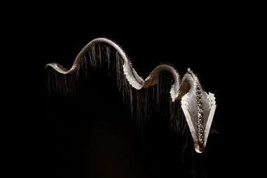 Amidst these politically charged landscape photographs, Lewis’ labored sculptures gain historical relevance and aesthetic value. In a private room tucked away at the end of a narrow hallway, Lewis’ It leaves a shining wake (2010) is suspended in darkness. This serpentine creature is constructed with silver zippers, and its undulating spine glimmers under the spotlight from above. White threads hang delicately from its underbelly. What would otherwise be a whimsical dream-like sculpture becomes, in the context of global industrial capitalism, an indispensable tribute to freedom as a separate and laudable pursuit. Johansson Projects has done well in pairing these two artists. The juxtaposition shows that Lewis liberates objects from their mundane functions, and evokes the agency and latent potential of our routine lives.