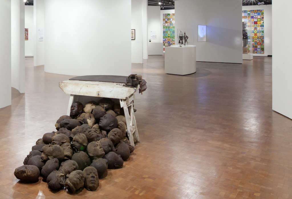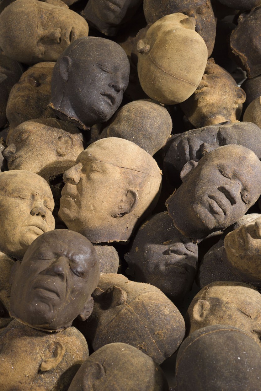 Caetano Dias’s arresting installation, The Ravings of Catherine (2014–2017), named after the first indigenous Brazilian woman to marry a Portuguese colonist, uses brown sugar, ox blood, and resin to cast a jumble of decapitated heads that tumble forth from an unfinished wooden table. While visually effective, Dias’s engagement with the materiality of slavery inevitably invites comparisons to Kara Walker’s A Subtlety, the Domino Sugar factory sculpture, in a U.S. context, and, perhaps less obviously, works such as Ai Weiwei’s A Ton of Tea or Rirkrit Tiravanija’s Pad Thai, all of which use fetishized materials—sugar, tea, pad thai as shorthand for racial or ethnic identities.