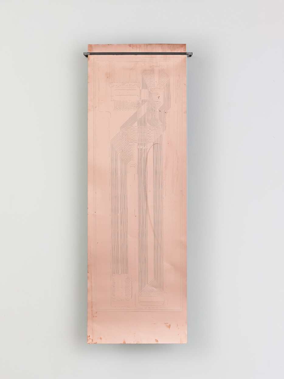 Sam Lewitt. Flexible Control (No Touch Through Me Lineament), 2013; photolithographic etchings on copper-clad plastic, laminate, steel bracket; 60 x 22 in. Courtesy of the Artist and Miguel Abreu Gallery, New York.