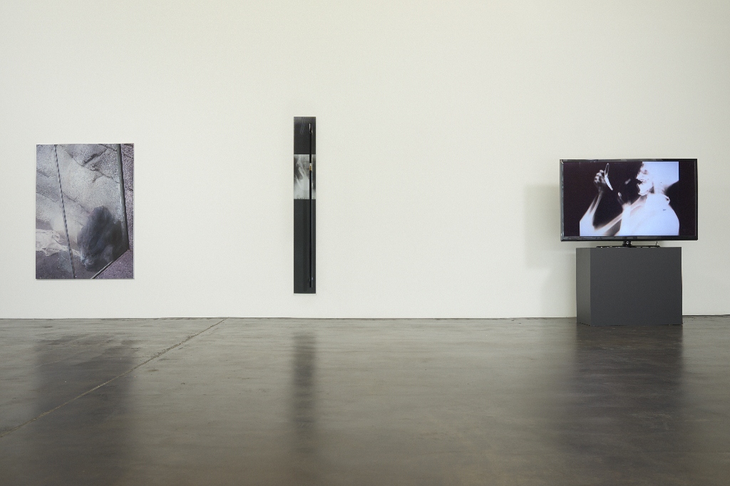 (from left to right) Lucie Stahl. East of Eden, 2014; inkjet print, aluminum, epoxy resin; 60 x 43 in. Cooper Jacoby. Optimal Clot, 2015; door handle: power-coated steel, Lucite, ferrofluid; black mirror, perforated vinyl; 76.5 x 9.5 in. Barbara Hammer. Sanctus, 1990; 16 mm film, sound by Neil B. Rolnik; 19 min. Courtesy of the Artists and Fused Space, San Francisco.