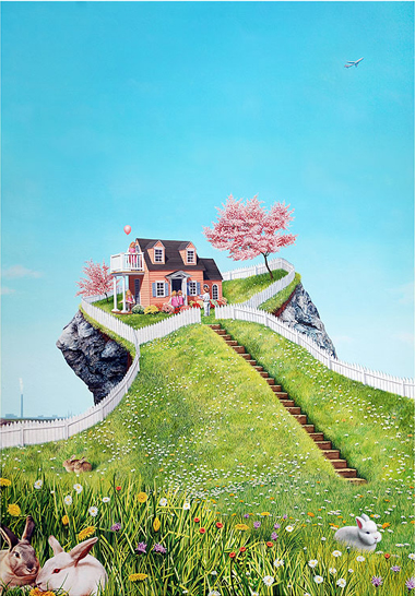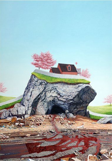 The second panel of the diptych takes the viewer to the back of the house where things aren’t as pretty as they once seemed. A dark, deep wound in the rock that is the foundation to the house emits a stream of blood (or something red and serious) and collects amongst piles of scattered rubbish. Like the pages of a book, the panels in this diptych allow for a type of reading that has a beginning and an end. But in the case of Front and Rear, it’s not just a story of heaven and hell or the beautiful and the ugly: all the particulars, the details and debris, like the dense textual elements found in the novels of Nabokov or Joyce, help to slow down the “reading,” which allows multiple stories to unfold through the relatedness of the detritus to other objects and characters in the scenes. This turns simple fairy-tale or dialectic themes into densely woven narratives where the tragic and comic, serious and absurd, can come together, play, then proliferate. As a result, the utopias depicted in Blue Skies and in the title itself become complicated, compromised spaces that can be read again and again.