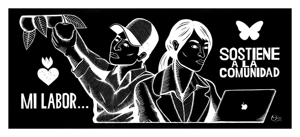 Oree Originol’s untitled work stood out from the others with its minimal style and expanses of uninterrupted ink. On one end, a man plucks an apple from a tree; on the other, a woman in a suit coat works on an Apple laptop, casting a sideways glance to the farmworker behind her. Text on the print reads: “Mi labor… sostiene a la comunidad.” (“My work sustains the community.”) Originol sardonically depicts the value placed on different types of laborers. Though the woman’s profession is unknown, it is unlikely that her work is as central to sustaining life as the farmworker, whose work is devalued culturally and legally.