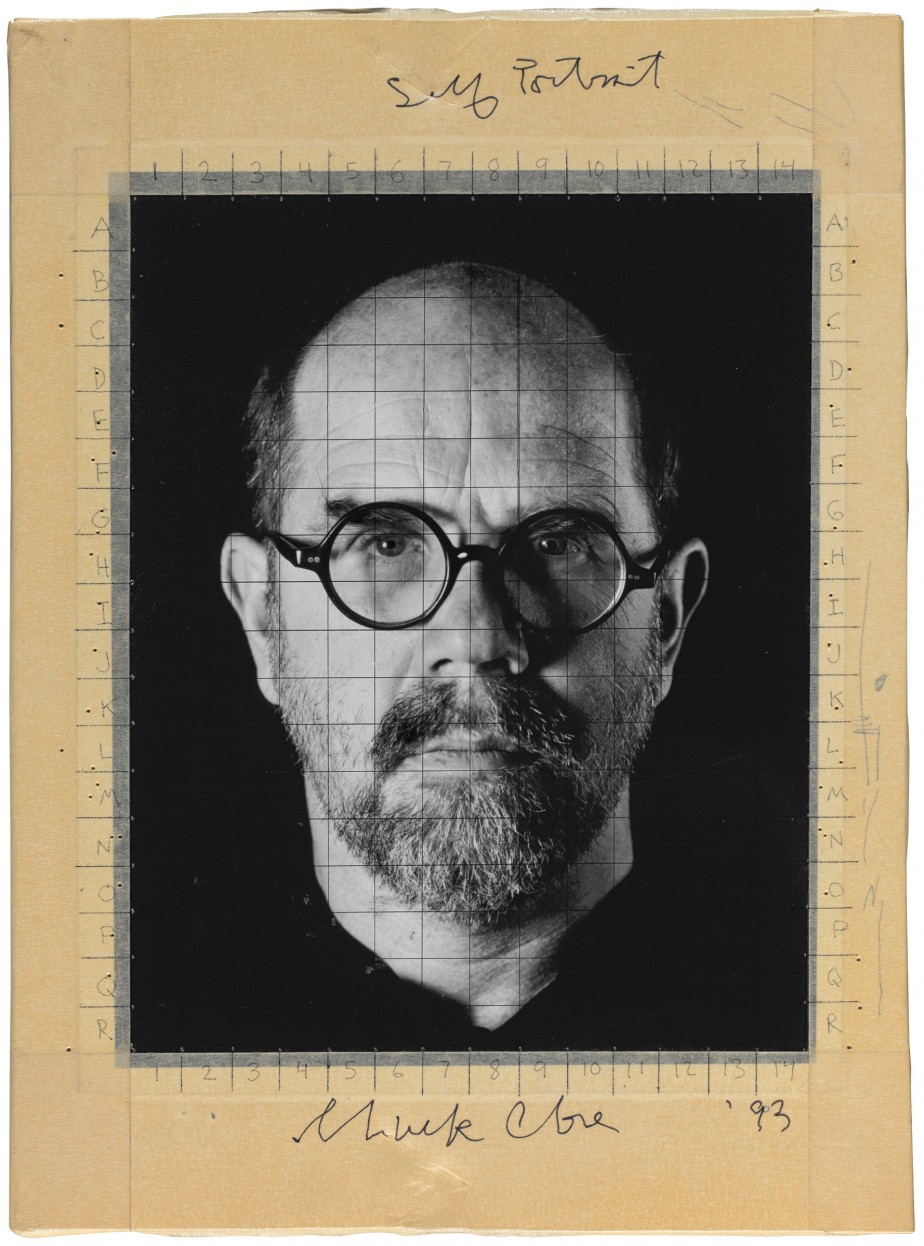 Chuck Close. Self-Portrait (Maquette), 1993; black-and-white Polaroid with ink and tape mounted to foamcore; 9 3/8 x 7 3/8 inches. Courtesy of the Artist and Pace Gallery. © Chuck Close.
