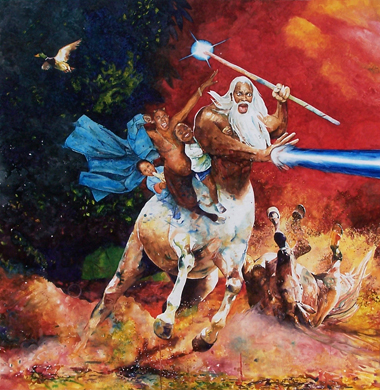 The most bombastic piece in the show, Go Go Love Don't Go (2009), is also the most representative of Ruiz's stated mission. In it, the comedian Tracy Morgan is painted as a satyr who, along with two unidentified young girls (one happily munching upon a banana), is riding atop the black centaur character from 1984's The Neverending Story. The three riders appear to be graciously enjoying themselves while the centaur—fiery scepter in one hand, bright blue laser beam shooting from the other—is a screaming blaze of horse and black man with a white mane and piercing eyes. In the background, a stallion lies in waste, wrenching upon its back, amidst what appears to be some sort of cosmic supernova, beautifully toned in fiery reds and a cool blue-green. In the upper left, a mallard, inexplicably and apparently unrelated, takes flight. This inexplicability also extends to the inclusion of Morgan in the painting, or for that matter, a black centaur with snow-white hair. Ruiz’s signature brand of humor is a key factor in how “Cold, Hard and Wet” attains—for better or worse—its unavoidable entertainment value.