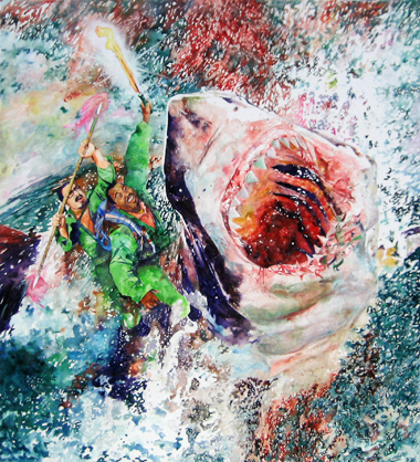 In another work, Multiple Peaks (2009), seven snow skiers float airborne in a blue sky in various gymnastic contortions, all smiling widely and firing what look to be fully automatic handguns. In Rough Riders (2008), a hideously ferocious shark, razor-filled maw wide open, emerges from a sea that spits saltwater and possibly blood upon the canvas. Ruiz saves the viewer from a potentially serious Sturm und Drang moment by inserting a couple of adventuring-seeking bros riding along the shark's back; one holding a glowing spear, and the other brandishing what is either a light saber or signal flare.
