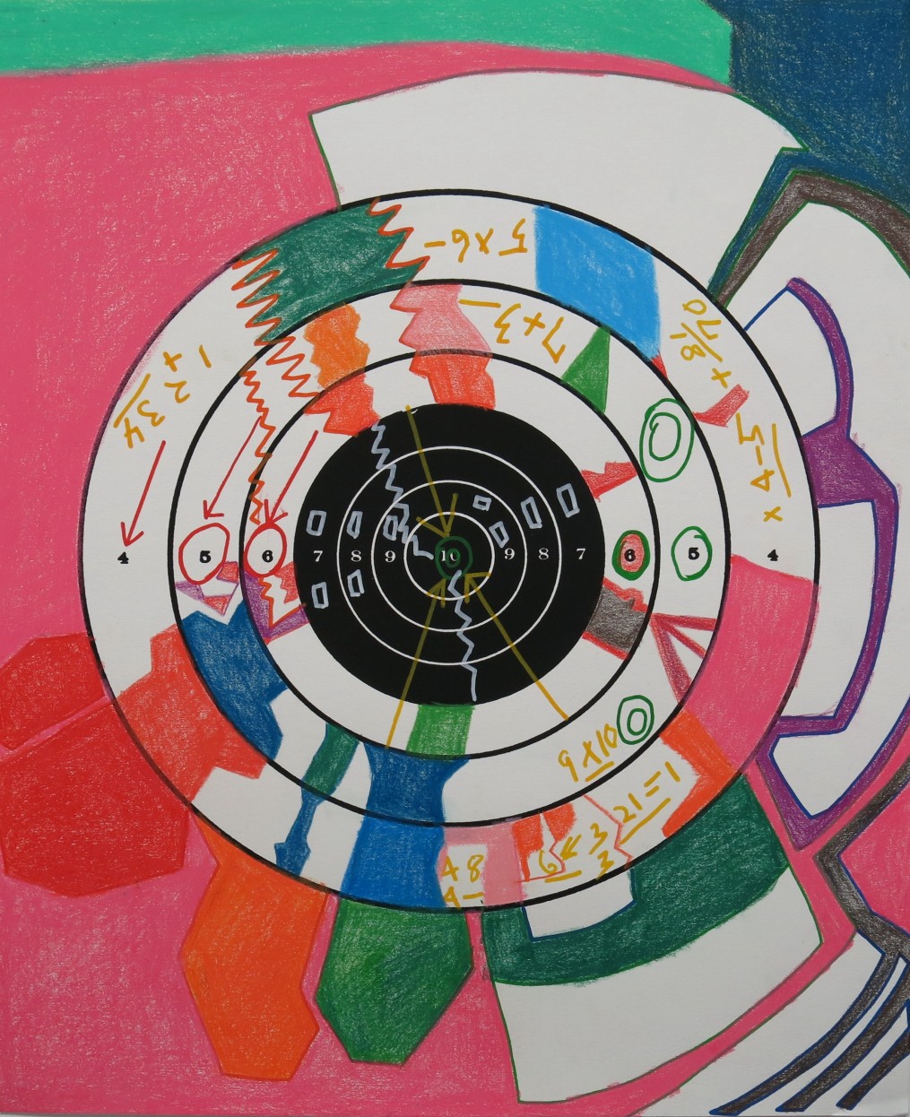 Each print becomes, in effect, a test case in the limits and/or possibilities of collaborative image making. A few of the artists reject outright the base image: John Mullins, for example, all but ignores Trisha Donnelly’s black-and-white photo print of a clouded sky, covering it with his own full-color painting of a bridge during rush-hour traffic. By contrast, Cedric Johnson’s over-paint of swatches of green and red between the arcs of Nate Lowman’s bull’s eye (a sly reference to his own “bullet hole” installations) plays on Lowman’s use of line and numerology, the layers of abstract color fields covered with handwritten equations that engage with the original’s use of numbers while still preserving its integrity.