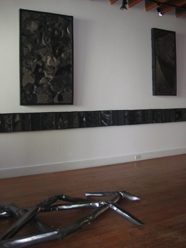 Cracked and cast, scratched and sanded, painted and polished—Sansing entirely reforms the notion of the chromosome. Each separate piece of scientific information is integrated and re-qualified with a loving will, resulting in a string of forty-seven genes that seem to form a footpath through the swallowed and charred remains of a forest fire; Sansing’s path is direct and focused, as if a flash of lightning has consumed the forest. No matter how dark or heavy the material with which Sansing works, his work feels weightless. The untitled sculpture (2010) on the floor feels like it is going to walk; the chromosome becomes chroma. Sansing achieves this effect by deleting what is irrelevant or unnecessary—only what remains valuable shines through.