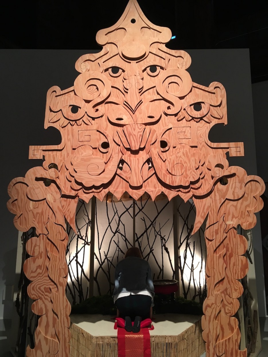 The Oracle (2017), a multimedia sculpture by missTANGQ and Chinn, utilizes video, animation, and sound to engage the ancient Chinese divination practice of Yi Jing. Participants remove their shoes before entering the temple-like wooden structure, and then kneel in front of a pool of water, beneath which is a screen. To activate the reading, one tosses a coin onto a copper plate. Depending on “fate,” they receive their reading, which includes an animation and text from one of the Yi Jing’s books.