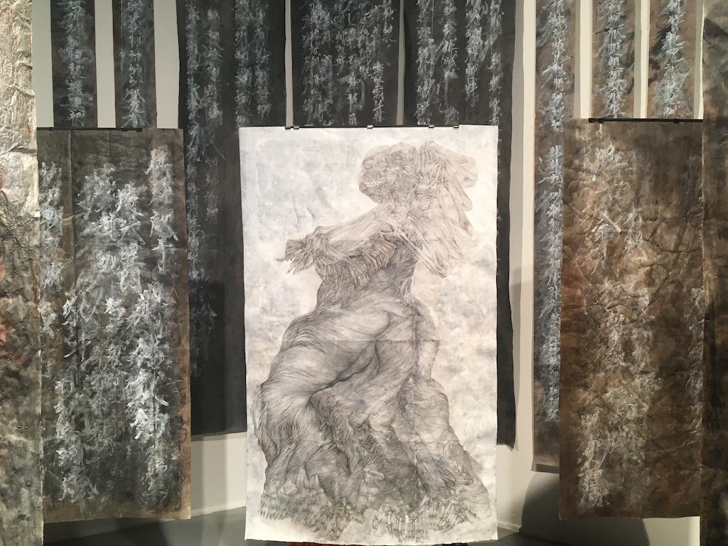 Also of note were Kevin Balcora’s Ancestral Tablets (2017), oversized multimedia works on paper that hang both on the wall and in space. The work is quietly commanding, and has a looming, suspended presence that stands out in the exhibition for its simplicity—and lack of technology. Each tablet features a water-warped and heavily treated piece of paper, layered with brush strokes of Chinese characters, recalling the traditional etchings of stone and marble ancestral tablets.