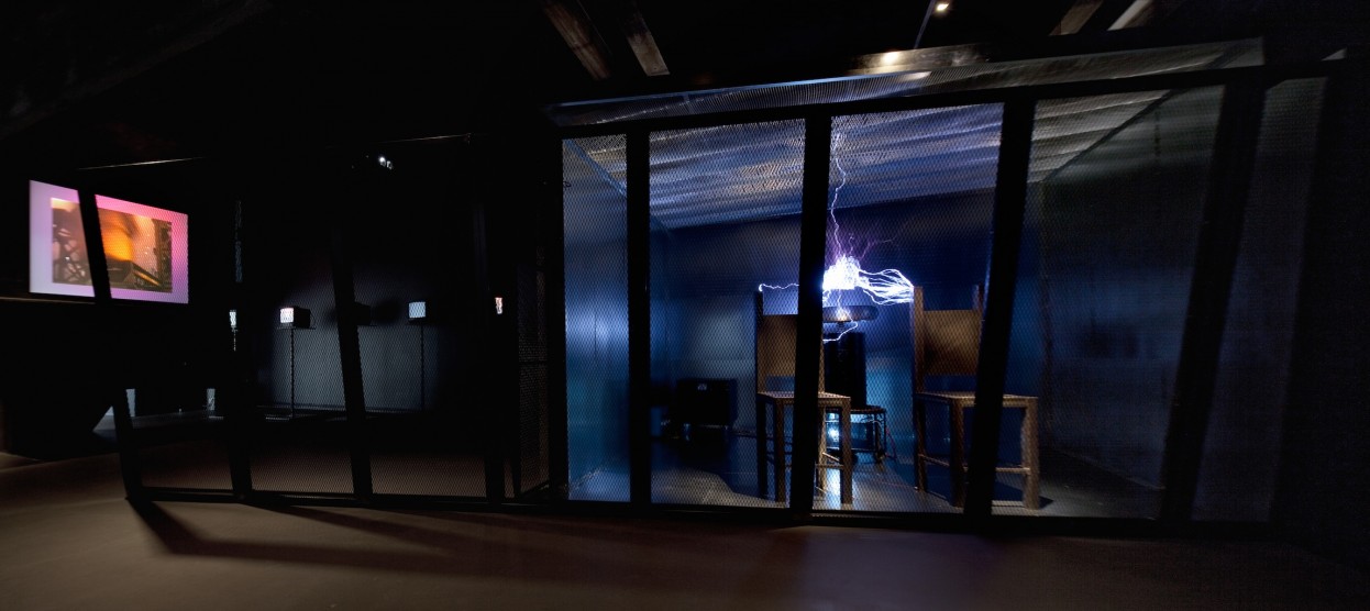 This is due in part to the deliberate, dark theatricality of the work’s sculptural elements. Across from the monitors, the dramatically tilted steel-mesh wall partly divides the space along its longer axis. On the barrier’s other side, deep in the shadows, the two metal chairs are imprisoned in their own mesh enclosure (the arrangement eerily bringing to mind media images of Guantanamo) with their attendant generating machinery. Periodically, “lightning” courses alarmingly between the two chairs for a few seconds, crackling in whitish sprays. While standing behind the steel wall in order to view the chairs, it is still possible to see the videos, but only through the mesh—suggesting that Hall wants his viewers either to be reminded of our separation from nature, or made conscious of the fact that we are too tiny and weak to stand up to the tremendous forces alluded to in the scenes playing constantly before us. It is not clear whether we need to be penned in—protected from nature—or shielded from our own worst impulses.