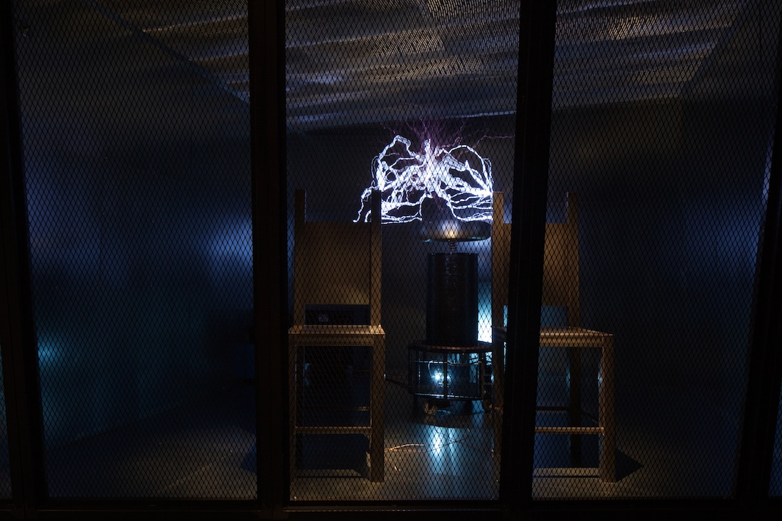 Since the opening of the SFMOMA’s Mario Botta–designed building in 1995, however, the piece has been unseen here in the Bay Area. Rumors suggested that the high voltage generated by the coil could not be accommodated by the complicated electrical/HVAC systems of the new building. Whatever the reason, SFMOMA’s closure for expansion in 2013 has allowed for programming at other institutions around town (“SFMOMA on the Go”), creating an opportunity for the current co-presentation of Hall’s piece at the San Francisco Art Institute’s McBean Gallery.