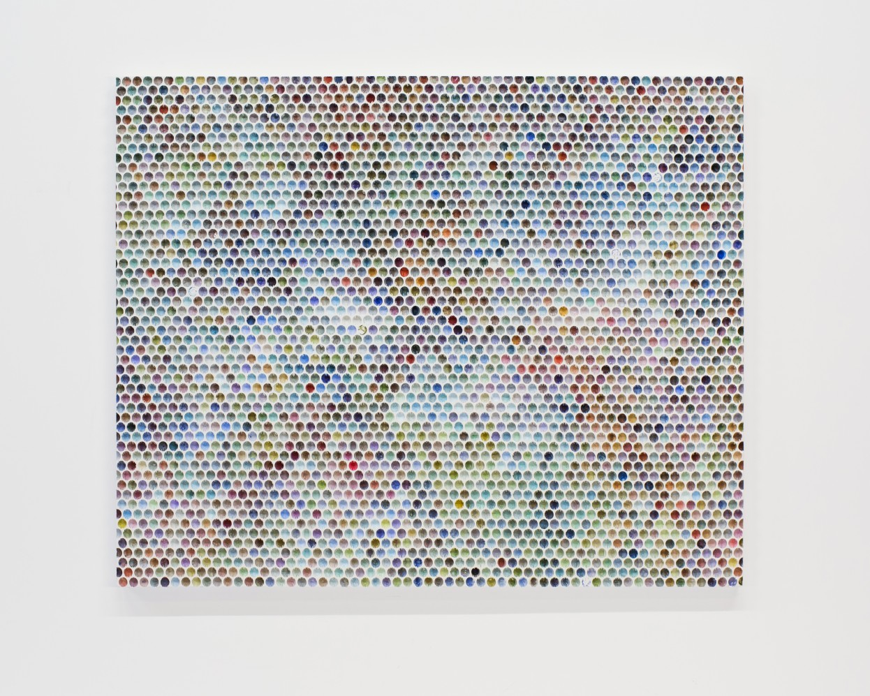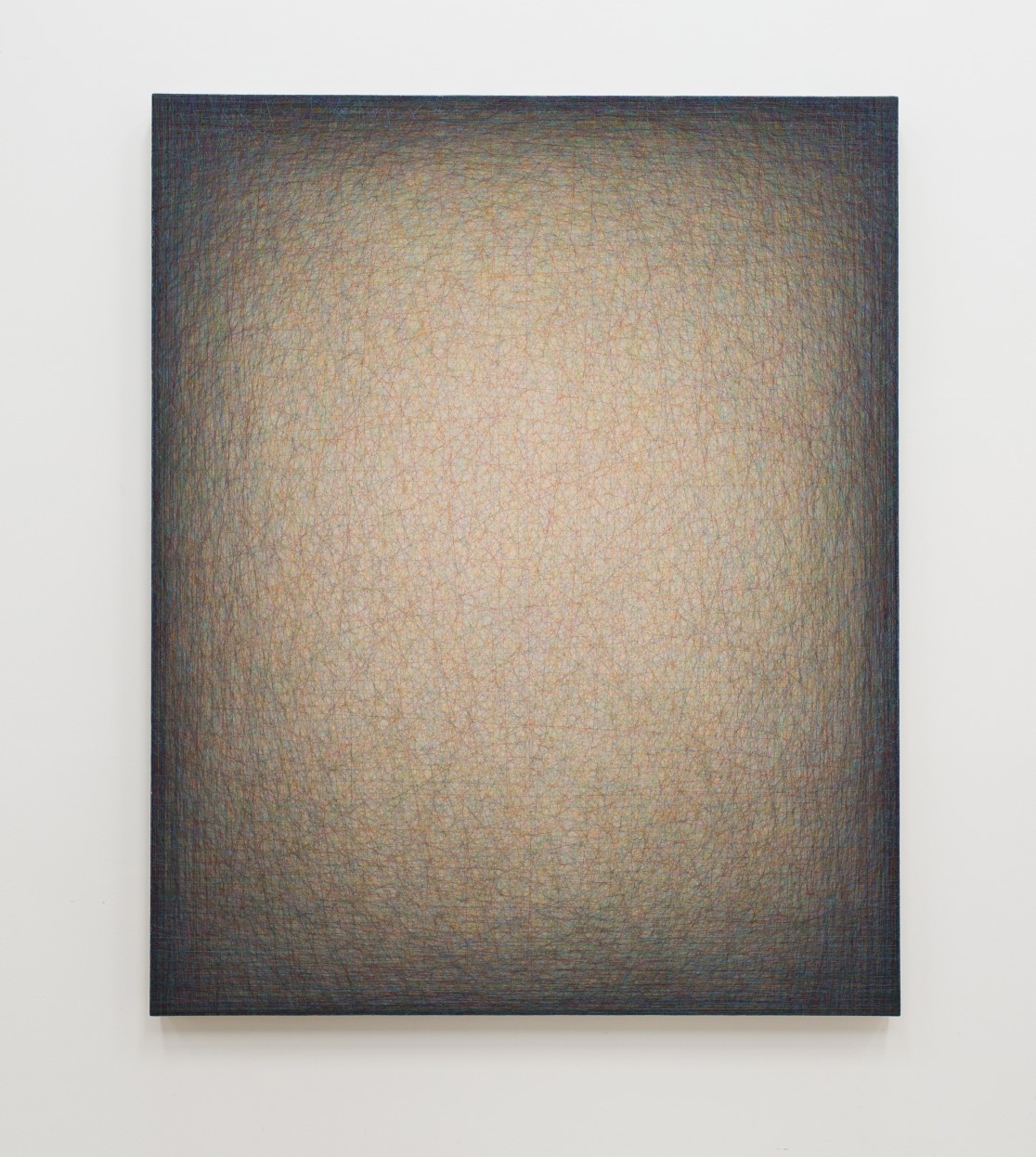 The exhibition takes its title from the opening artwork, The Ring of Distant Events #1438 (2015). Less painting, and more like weaving, the rainbows of vibrant colored thread that Lukas uses are drawn across the surface of a painted wood frame backed with a reflective film and affixed to the side with small nails. Countless layers of thread create a mesmerizing and tactile depth, moving Lukas’ work from two dimensions to three. AN increase in the density of thread toward the periphery of the frame results in the illusion of luminescence, as the glowing white surface of the reflective backing shows through the web of thread near the center of the painting. Similarly haptic and sculptural, Tri Condition #1439 (2015)—one of the two bubble paintings in the exhibition—is a plaster cast of bubble wrap. Lukas transforms this banal, human-made material into a honeycomb of vivid pastel color.