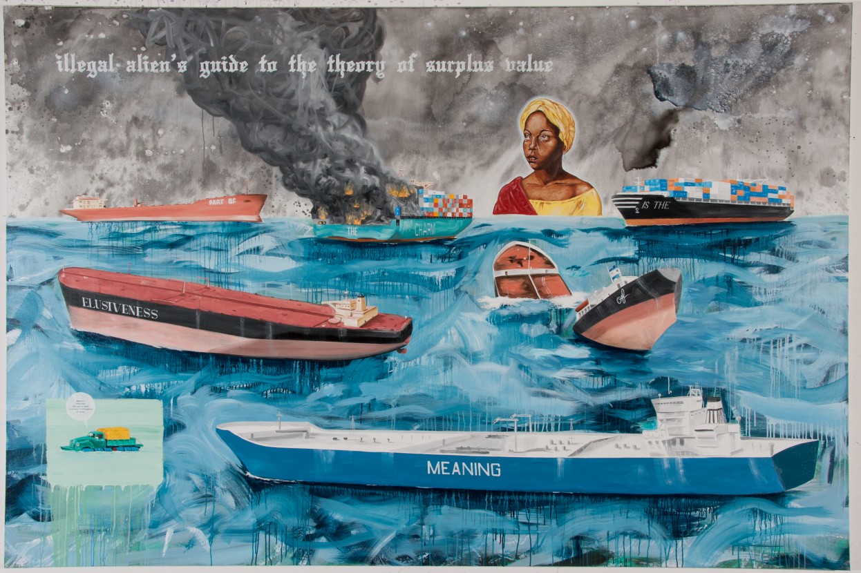 Enrique Chagoya. Illegal Alien’s Guide to the Theory of Surplus Value, 2009; acrylic and water based oils canvas; 80 x 120 in. Courtesy of Anglim Gilbert Gallery, San Francisco.