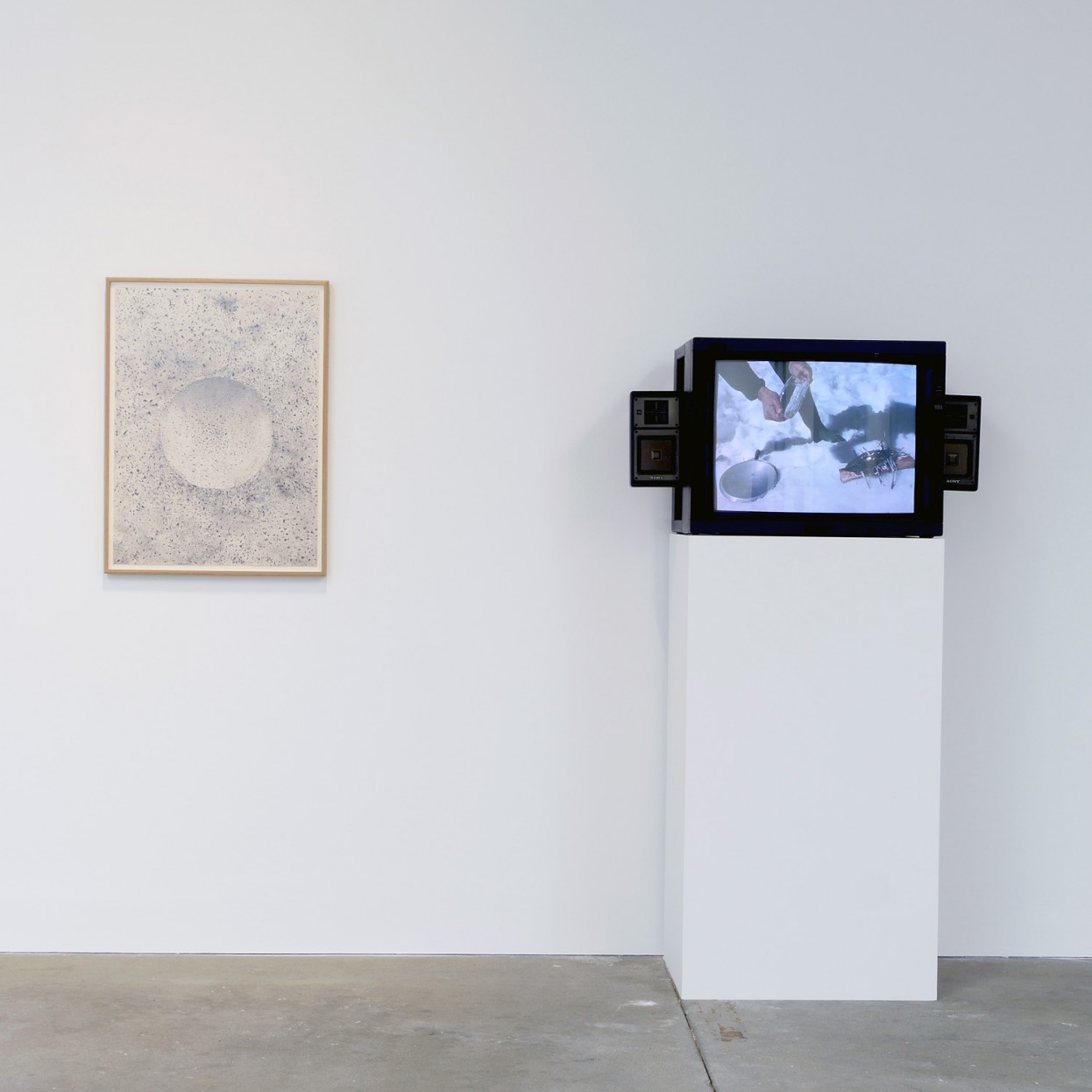 Paul Kos. Equilibrium: A Paul Kos Survey, installation view; The Drawing for a Tool: Ice Lens Maker, 1974; watercolor and ink; 30 x 22 in.; and Ice Makes Fire, 1974/2004; single-channel video, color, sound; 5:21. Courtesy of di Rosa, Napa. Photo: Wilfred J. Jones.