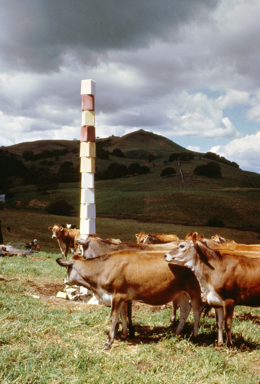 That there are no definitive answers to such questions doesn’t mean they aren’t worth raising. We might note that most of Equilibrium’s twenty-six works are drawn from 1968 to 1974—a high point of countercultural activity in the 20th-century United States, an era of protest and happenings, of consciousness expansion and attacks on institutional oppression—as we turn to what the show identifies as Kos’s first conceptual piece: Lot’s Wife (1968–69). It is represented here by two sets of photographs (gelatin silver prints and chromographic prints) depicting an ephemeral sculpture on the grounds of di Rosa made from a pillar of multicolored salt licks and a herd of Jersey cattle. The artwork itself, however, is again a process, the gradual disappearance of the pillar under the rough tongues of the cows.