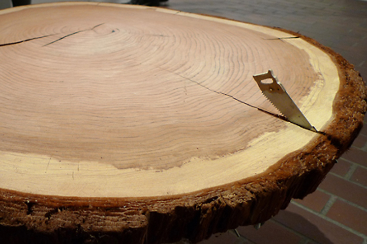 Berlier frames her show in terms of the passage of time. Some artworks mark the ticking seconds via the back-and-forth motion of a rocking chair, the subject of both I Would Not Change It and I’m Dying; This is a New Experience (both 2013). They also mark the length of a visit to the show, via the repetitions of the Beatles’s Here Comes the Sun emanating from When Comes the Sun (2012), a machine powered by a solar panel mounted on the museum’s roof. Several pieces reference the longer intervals encoded in tree rings and even the unfolding geological eras in the nine six-foot long ersatz “core samples” that compose Core Sampling (Tick Tock) (2009).