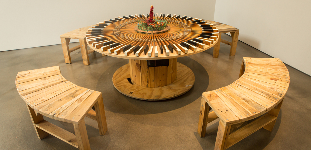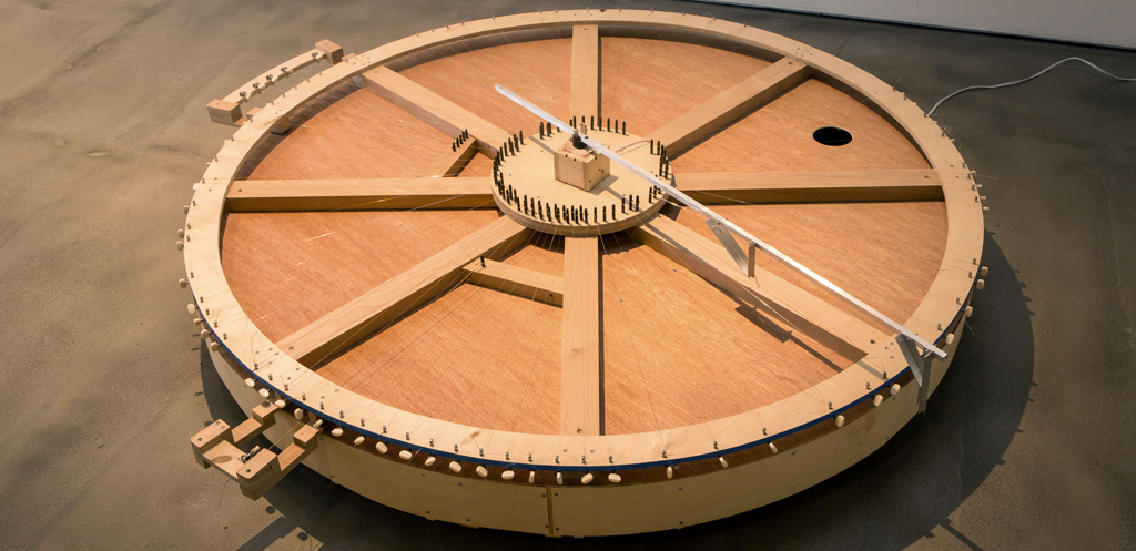But if time and sound are central concerns throughout Erased Loop Random Walk, it’s the artist’s process of craft and making that is at the heart of the exhibit. However campy, pieces such as Ambassador of Time (2013)—a tiny mechanized handsaw cutting through a redwood section—offer a rough-hewn antidote to the disconnection between production and consumption reflected in the polished surfaces of much contemporary product design. Berlier most explicitly confronts the complex relationships among what we have, where it comes from, and where it goes in Ekman Transport (Plastic Ocean) (2013), an undulating sculptural casting of bottles, cans, and other detritus, arranged in an eight-foot-diameter disc, representing a section of the ocean’s acquisitive surface.