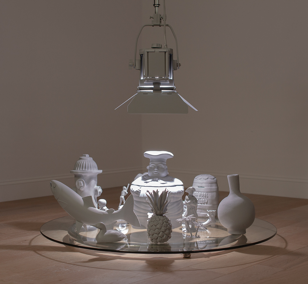 Juxtaposed against Yarbrough’s two-dimensional pieces are Mik Gaspay’s matte, gray sculptures, theatrically lit like props for a commercial. At the center of the room is Light, Figures (Immigrant Anthology) (2018), a sculpture comprising an assortment of found kitsch, delicately placed on a round glass tabletop (the kind your parents might have) that hovers just above the floor, the table’s legs having been reduced to a few inches. Devoid of color, Gaspay’s sculptures are painted in grisaille, thereby revealing the prototype-like form of a commercial object. As with Yarbrough’s pieces, there are familiar forms—like a pineapple and a jumping fish—and other, more eccentric forms, like a chef with a spout at its genitals. Across the room is Bananas, Bear, Box (Banana Republic) (2018), a tall sculpture of a bear that props a set of fake bananas on its head, covered by a bell jar. Gaspay’s sculptures have a dynamic quality of hyper-presentation—the objects are presented to the viewer as if the works want you to understand their intrinsic value.