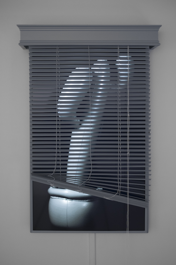 Mik Gaspay. Inflatable Cactus, Blinds (Saguaro), 2018; video, LED Monitor, venetian blinds, and cornice. 27 x 45 x 7 in. Courtesy of Bass & Reiner; Photo: Mik Gaspay.