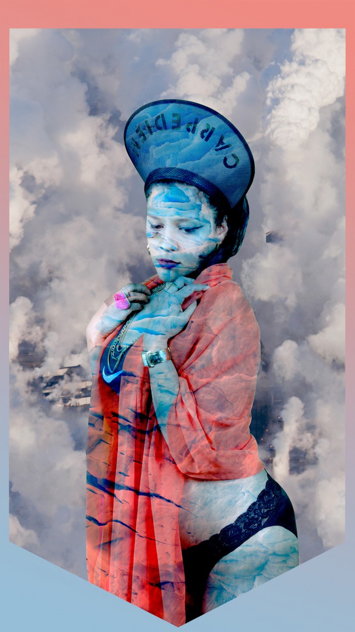 SIGLIOS, four large fabric pieces on which are printed stills from Echoes, has a devotional quality despite also being fun and glamorous. In the print on the far right, an avatar character appears over a layer of clouds. A vibrant red scarf contrasts with the bright blue visor she wears upside down on her head. It is impossible to determine definitively what time period she represents: a fractured, techno-inundated present? A signifier for future humans of a posterior history? The vertigo of this character’s origin is somewhat alleviated by the message on her visor, a message of our antiquity, and one that speaks to dreamers in all tenses and times: “CARPE DIEM.”