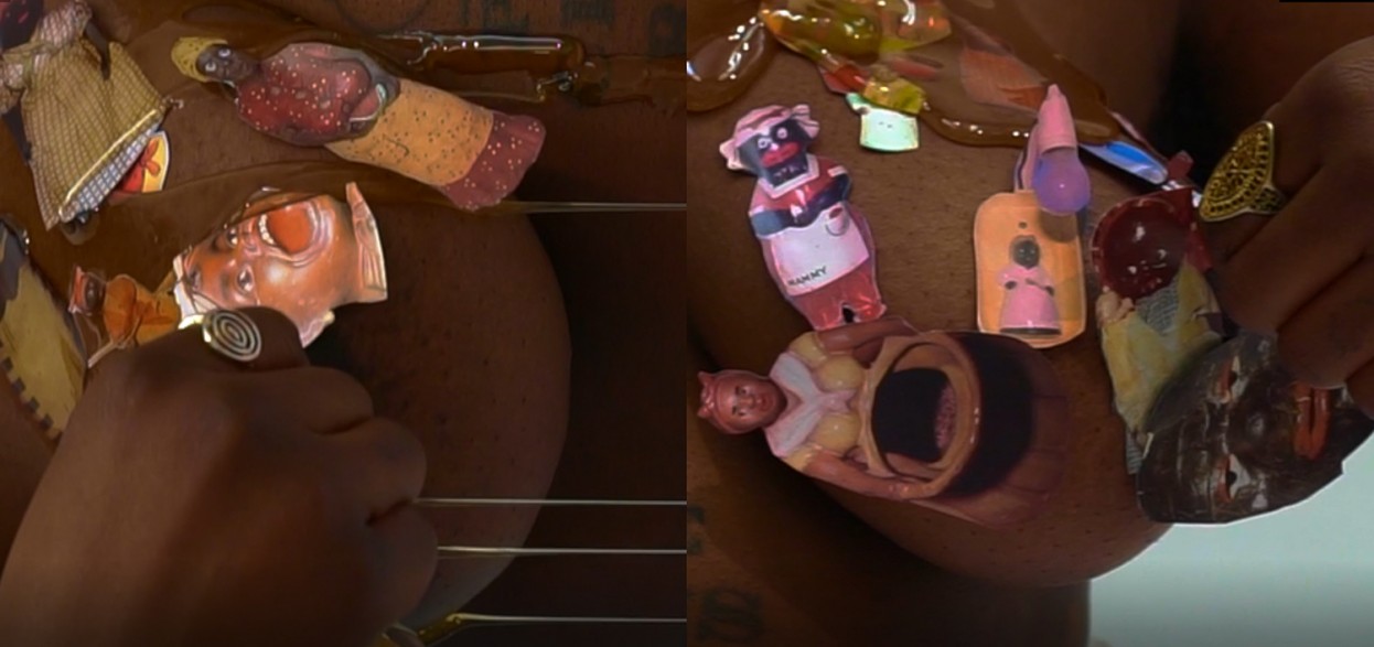 Upon entering the exhibition space, viewers encounter the sweet stays heavy and heavy and heavier (2018), a two-channel video on a mounted screen by the Oakland-based multidisciplinary artist, Yetunde Olagbaju. The soundless video opens with a close-up of a Black actor placing stickers of Mammy figurines onto their bare breast. A thick liquid (Aunt Jemima syrup, perhaps) is poured across their chest; as it drips down their body, the stickers slowly release from their skin, sliding off as gravity loosens their hold, and the actor wipes the sticky substance off their body with a red handkerchief.