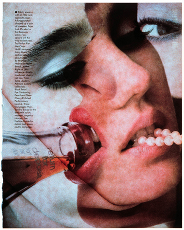 Heinecken’s sexually suggestive work offers a troubling reflection of the representation of women in mass media. Recto/Verso (1989) is a portfolio of color prints Heinecken made by directly exposing backlit magazine pages to photographic paper, in lieu of a negative, resulting in a composite of both sides of the original printed page. While magazine readers would see the images sequentially as they turn the pages, Heinecken’s photograms fuse them into single pictures. In one of the most charged photograms in the series, the profile of a woman drinking from a phallic bottle is superimposed on an image of a woman biting on a strand of pearls. Heinecken makes explicit the casual sexism embedded in the images created by advertising firms and their clients by creating a before-and-after narrative of fellatio, visually punning on the double meanings of the bottle and the pearl necklace.