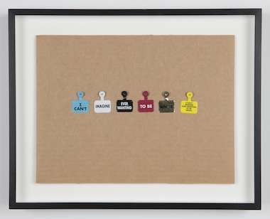 The strategy of going “head-first rather than image-first,” as Martinez phrased it, was learned from the major conceptual artists (Douglas Huebler, John Baldessari, Michael Asher) who began teaching at art schools in the 1970s. If the panel exposed a new provocative concern, it was a call for a more critical connection between Conceptual art and identity politics. Martinez’s 1993 Biennial piece illustrates the productive potential of this synthesis. Breaking up the controversial sentence, “I can’t imagine ever wanting to be white,” into phrases (I can’t, Imagine, Ever wanting, To be, White), he printed one phrase, and occasionally the full sentence, onto each of the tags given to visitors upon their entrance to the museum—which, it’s important to emphasize, they paid for. Martinez’s piece employed the visitors as its medium, using structural linguistics to address discrimination, ethnic identity, and the imaginary.5 The visitors’ unknowing engagement became a collective, coerced performance of admission, in the confessional sense.